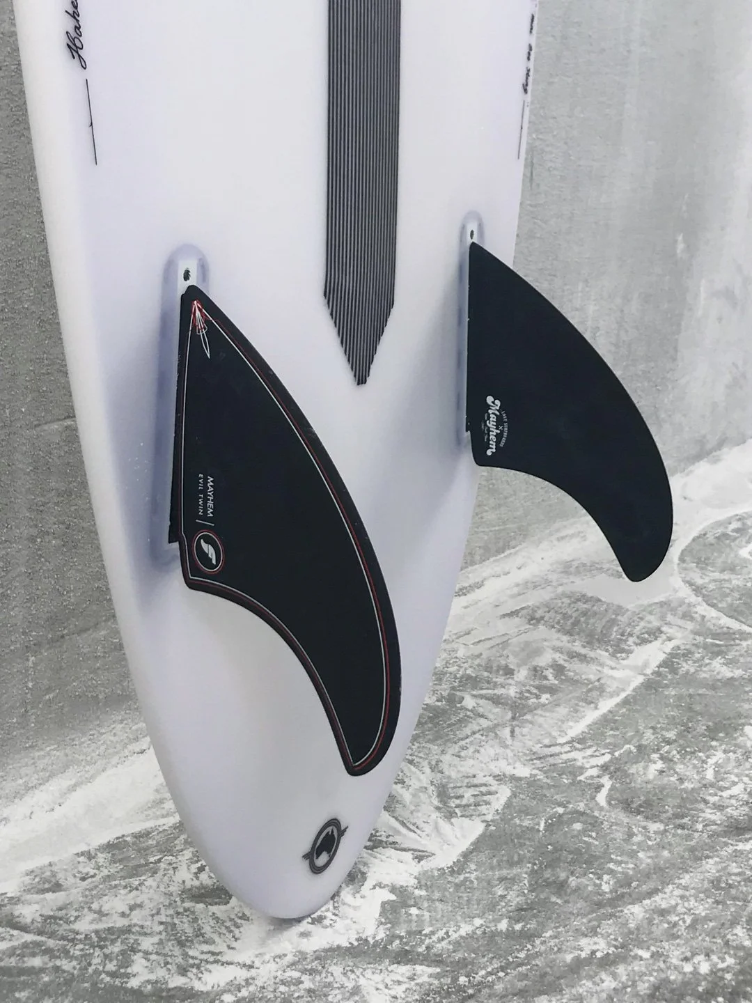 The Bee Sting was a twin fin I designed around eight years ago for big waves so I could keep that loose feeling and speed in large waves. It has a full nose outline pulled in the tail and a double concave tri-plan hull bottom contour.